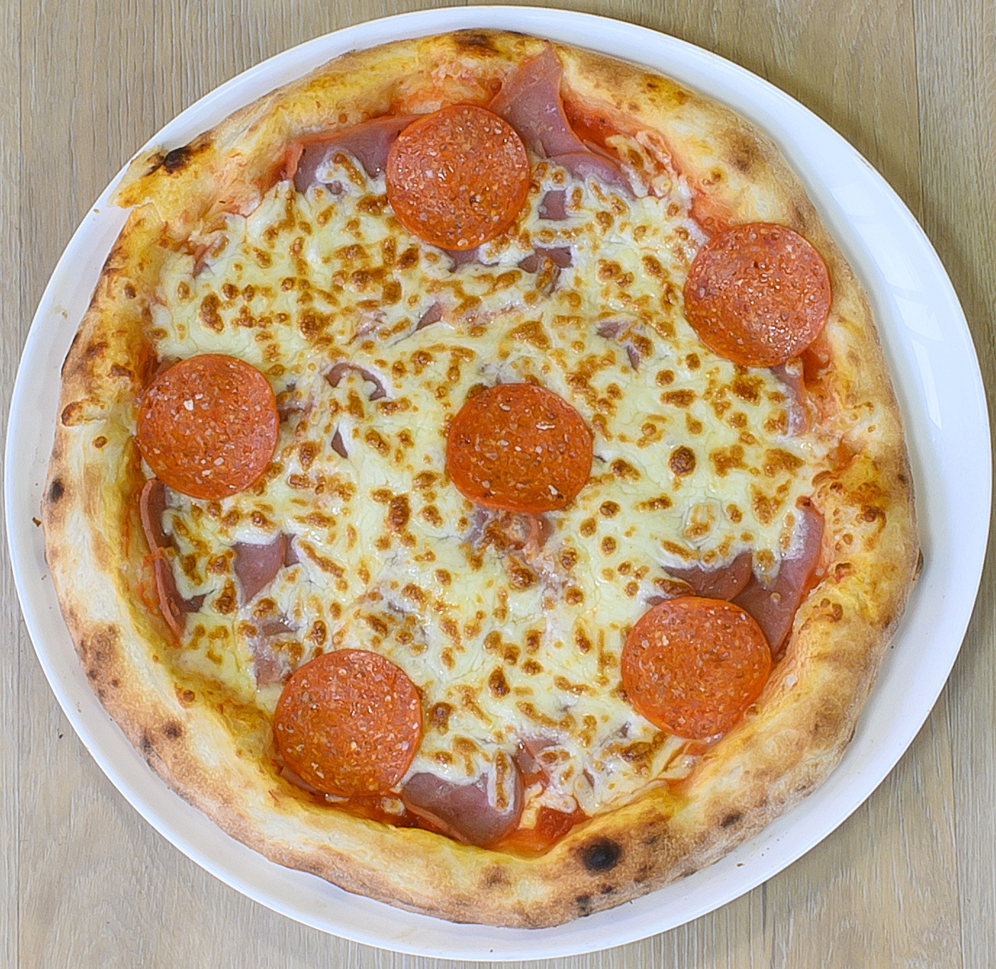 Sauce tomate, mozzarella, jambon halal, pepperoni halal, bacon.