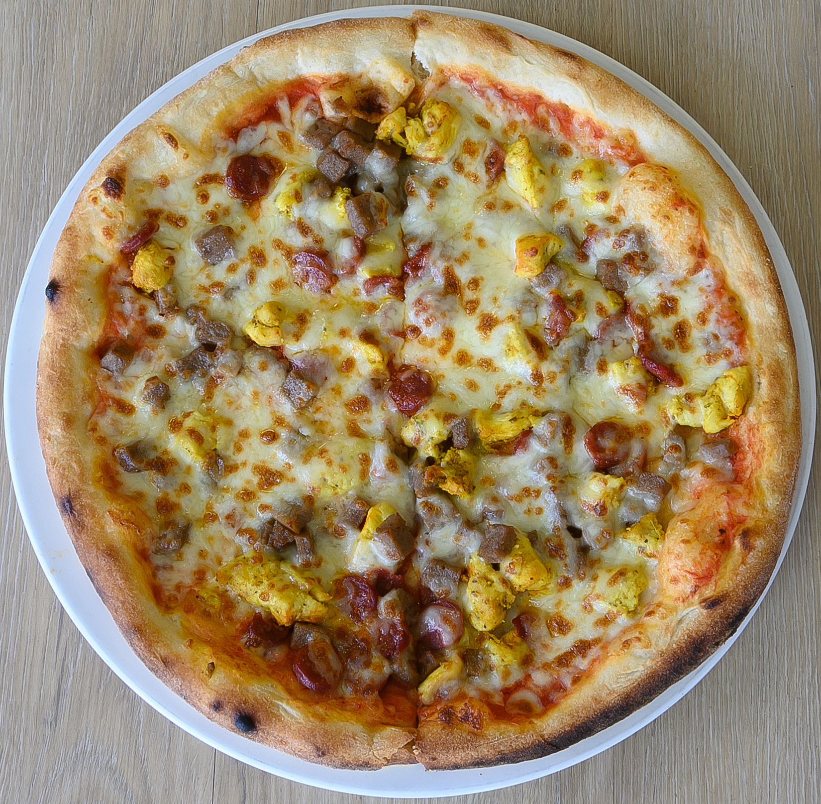 Sauce tomate, mozzarella, bœuf épicé, poulet, merguez.
