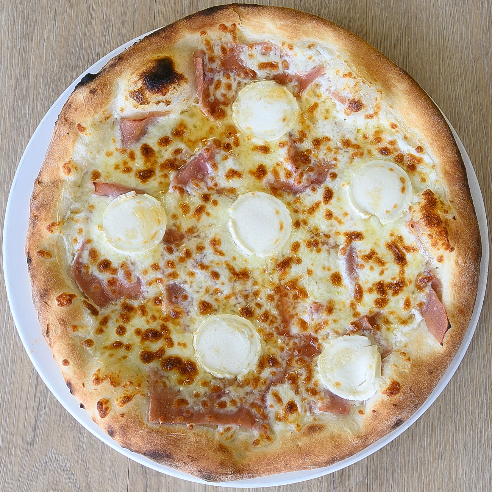 Crème fraiche, mozzarella, chèvre, jambon halal, miel.