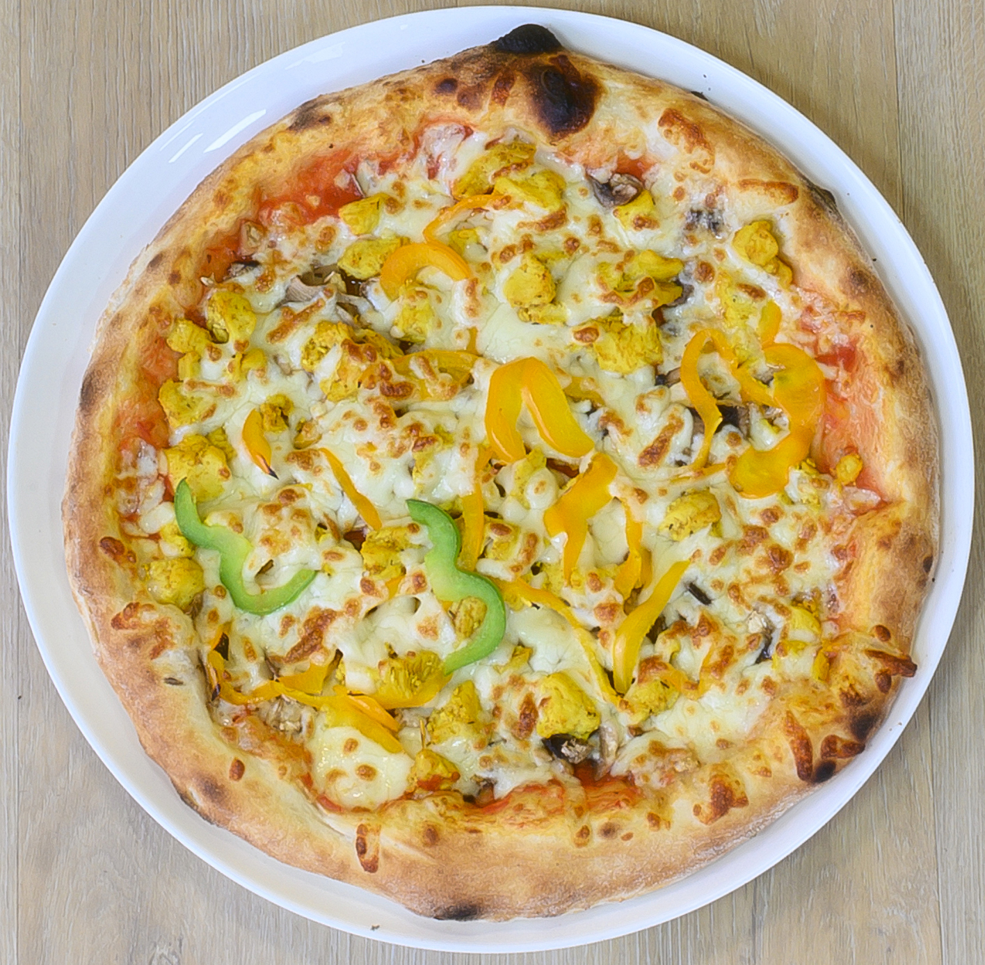 Sauce tomate, mozzarella, poulet halal, poivrons, champignons.