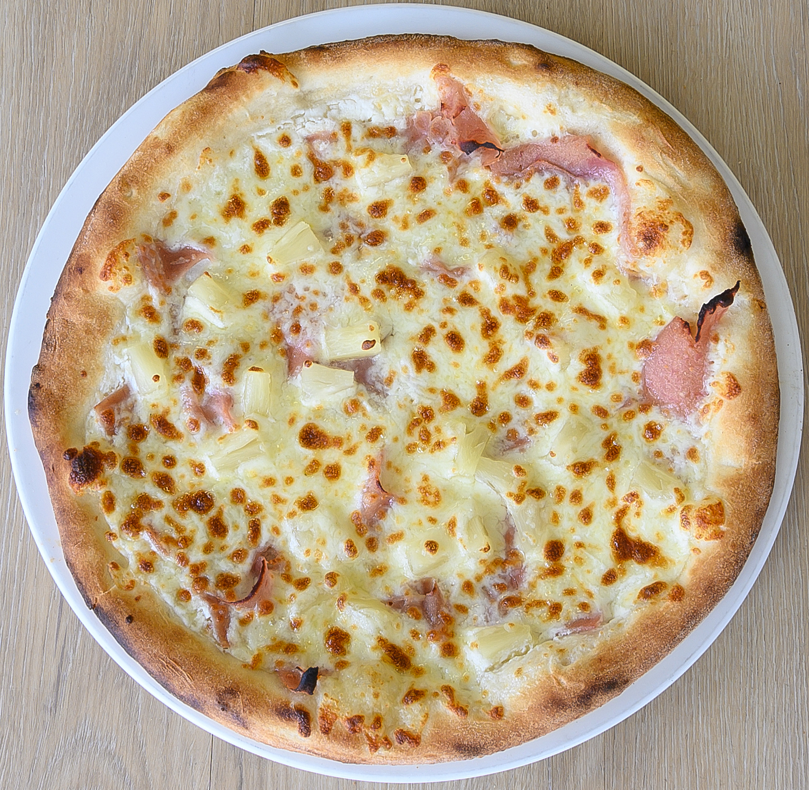Crème fraiche, mozzarella, jambon halal, ananas.