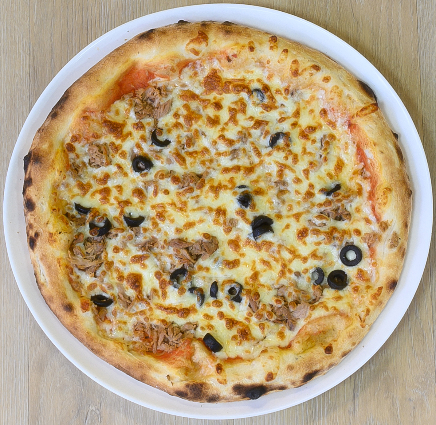 Sauce tomate, mozzarella, thon, oignons, olives.