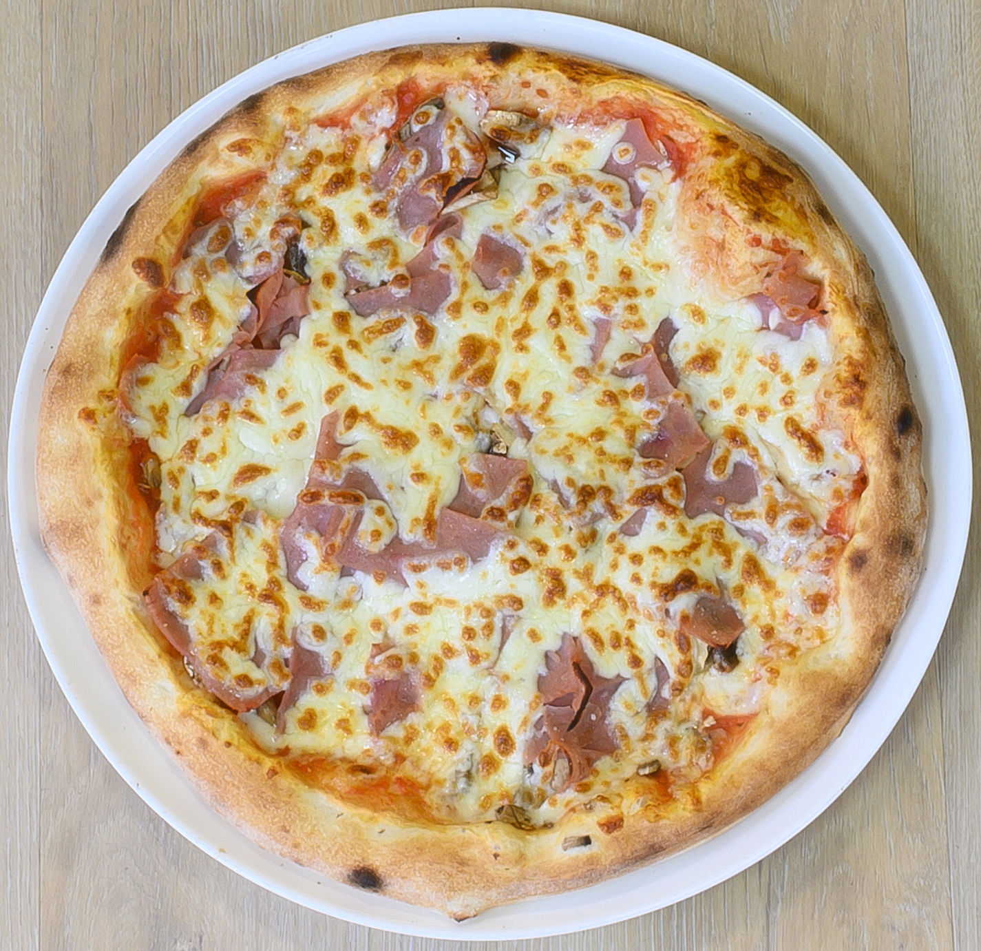 Sauce tomate, mozzarella, jambon halal, champignons.