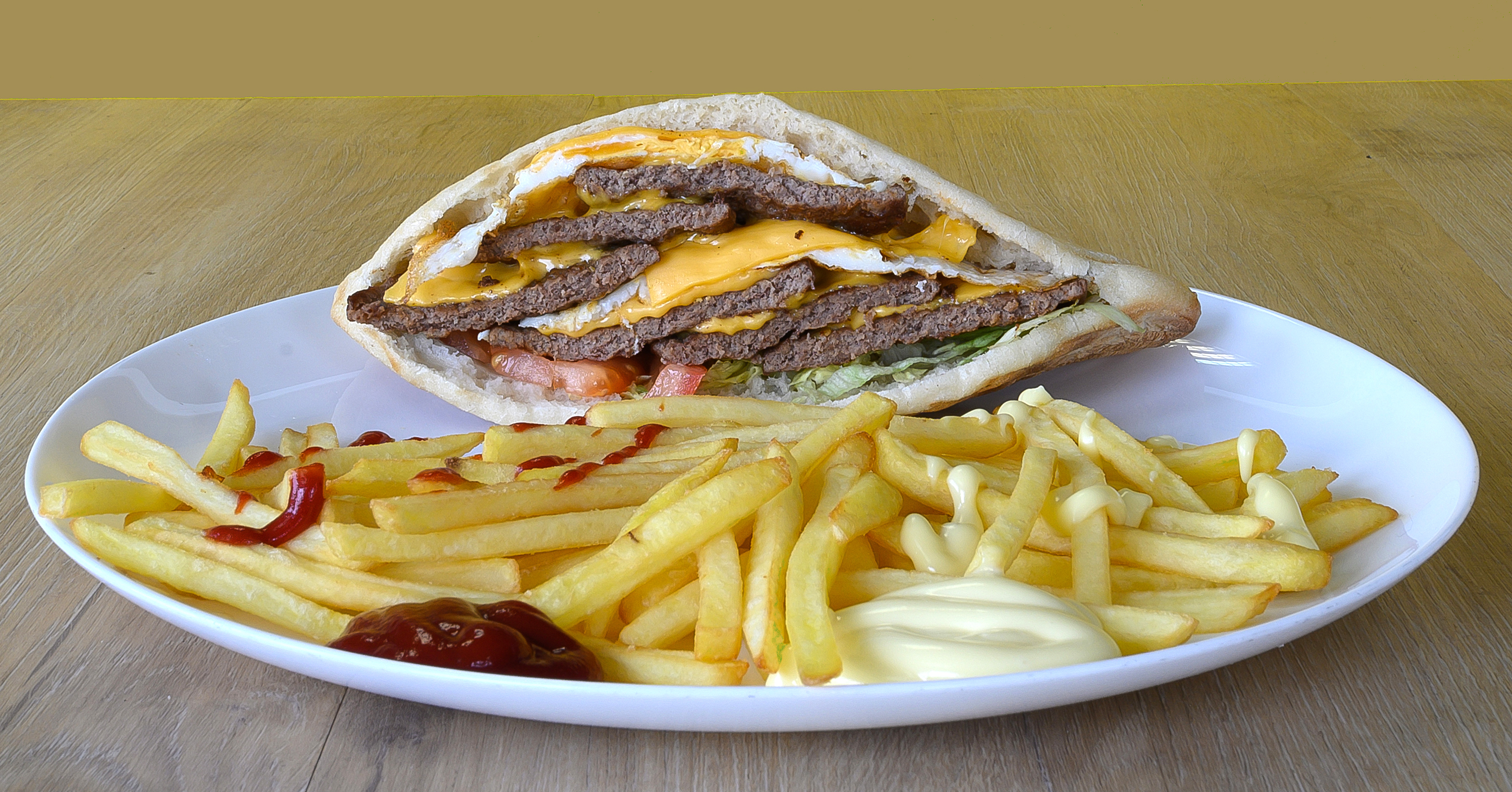 Escalope de poulet, sauce fromagère, cheddar, salade, tomate, oignons, sauce au choix